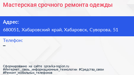Мастерская срочного ремонта одежды по адресу 680051, Хабаровский край, Хабаровск, Суворова, 51 в дальнейшем Организация, размещена в следующих категориях:
