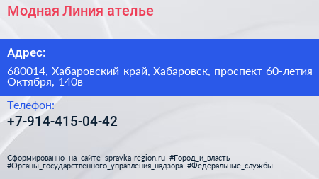 Модная Линия, ателье по адресу 680014, Хабаровский край, Хабаровск, проспект 60-летия Октября, 140в в дальнейшем Организация, размещена в следующих категориях: