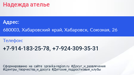 Надежда, ателье по адресу 680003, Хабаровский край, Хабаровск, Союзная, 26 в дальнейшем Организация, размещена в следующих категориях: