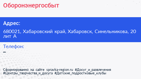Оборонэнергосбыт по адресу 680021, Хабаровский край, Хабаровск, Синельникова, 20 лит А в дальнейшем Организация, размещена в следующих категориях: