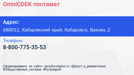 OmniCDEK, постамат по адресу 680012, Хабаровский край, Хабаровск, Вахова, 2 в дальнейшем Организация, размещена в следующих категориях: