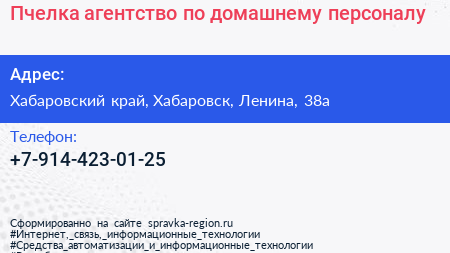 Пчелка, агентство по домашнему персоналу по адресу Хабаровский край, Хабаровск, Ленина, 38а в дальнейшем Организация, размещена в следующих категориях: