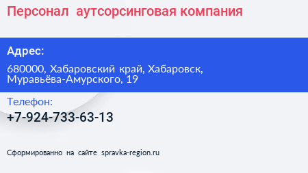 Персонал+, аутсорсинговая компания по адресу 680000, Хабаровский край, Хабаровск, Муравьёва-Амурского, 19 в дальнейшем Организация, размещена в следующих категориях: