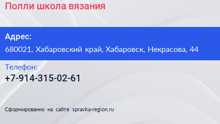 Полли, школа вязания по адресу 680021, Хабаровский край, Хабаровск, Некрасова, 44 в дальнейшем Организация, размещена в следующих категориях: