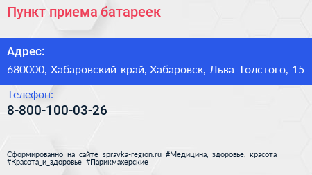 Пункт приема батареек по адресу 680000, Хабаровский край, Хабаровск, Льва Толстого, 15 в дальнейшем Организация, размещена в следующих категориях:
