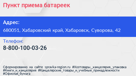 Пункт приема батареек по адресу 680051, Хабаровский край, Хабаровск, Суворова, 42 в дальнейшем Организация, размещена в следующих категориях: