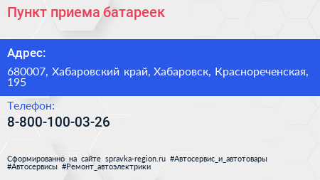 Пункт приема батареек по адресу 680007, Хабаровский край, Хабаровск, Краснореченская, 195 в дальнейшем Организация, размещена в следующих категориях: