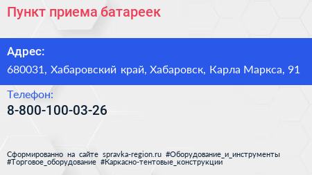 Пункт приема батареек по адресу 680031, Хабаровский край, Хабаровск, Карла Маркса, 91 в дальнейшем Организация, размещена в следующих категориях: