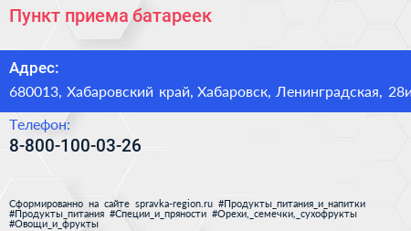 Пункт приема батареек по адресу 680013, Хабаровский край, Хабаровск, Ленинградская, 28и в дальнейшем Организация, размещена в следующих категориях: