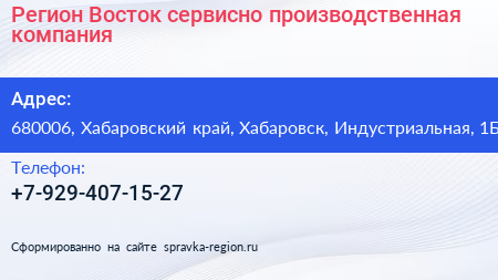 Регион-Восток, сервисно-производственная компания по адресу 680006, Хабаровский край, Хабаровск, Индустриальная, 1Б в дальнейшем Организация, размещена в следующих категориях: