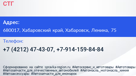СТГ по адресу 680017, Хабаровский край, Хабаровск, Ленина, 75 в дальнейшем Организация, размещена в следующих категориях: