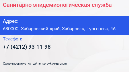 Санитарно-эпидемиологическая служба по адресу 680000, Хабаровский край, Хабаровск, Тургенева, 46 в дальнейшем Организация, размещена в следующих категориях:
