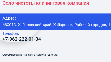 Соло чистоты, клининговая компания по адресу 680013, Хабаровский край, Хабаровск, Рабочий городок, 14 в дальнейшем Организация, размещена в следующих категориях: