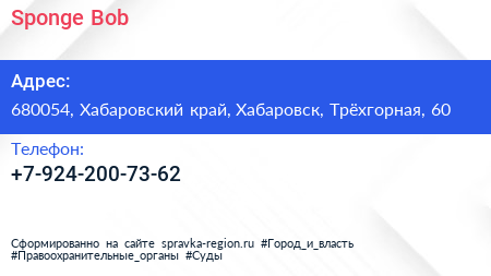 Sponge Bob по адресу 680054, Хабаровский край, Хабаровск, Трёхгорная, 60 в дальнейшем Организация, размещена в следующих категориях: