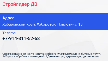Стройлидер ДВ по адресу Хабаровский край, Хабаровск, Павловича, 13 в дальнейшем Организация, размещена в следующих категориях: