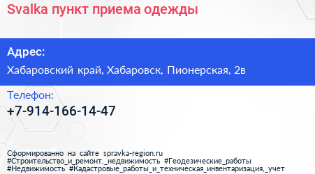 Svalka, пункт приема одежды по адресу Хабаровский край, Хабаровск, Пионерская, 2в в дальнейшем Организация, размещена в следующих категориях: