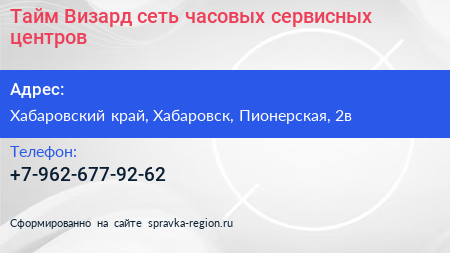 Тайм Визард, сеть часовых сервисных центров по адресу Хабаровский край, Хабаровск, Пионерская, 2в в дальнейшем Организация, размещена в следующих категориях: