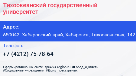 Тихоокеанский государственный университет по адресу 680042, Хабаровский край, Хабаровск, Тихоокеанская, 142 в дальнейшем Организация, размещена в следующих категориях: