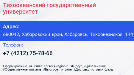 Тихоокеанский государственный университет по адресу 680042, Хабаровский край, Хабаровск, Тихоокеанская, 144 в дальнейшем Организация, размещена в следующих категориях: