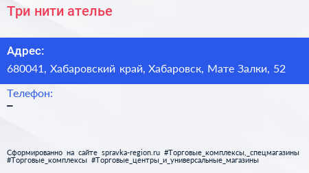 Три нити, ателье по адресу 680041, Хабаровский край, Хабаровск, Мате Залки, 52 в дальнейшем Организация, размещена в следующих категориях: