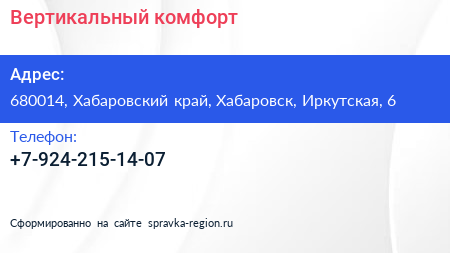 Вертикальный комфорт по адресу 680014, Хабаровский край, Хабаровск, Иркутская, 6 в дальнейшем Организация, размещена в следующих категориях: