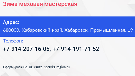 Зима, меховая мастерская по адресу 680009, Хабаровский край, Хабаровск, Промышленная, 19 в дальнейшем Организация, размещена в следующих категориях: