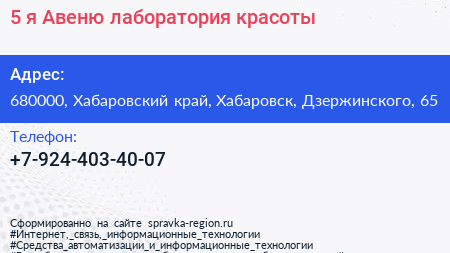5-я Авеню, лаборатория красоты по адресу 680000, Хабаровский край, Хабаровск, Дзержинского, 65 в дальнейшем Организация, размещена в следующих категориях: