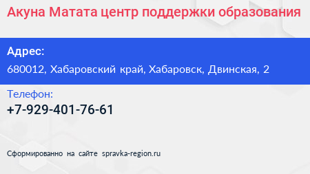 Акуна Матата, центр поддержки образования по адресу 680012, Хабаровский край, Хабаровск, Двинская, 2 в дальнейшем Организация, размещена в следующих категориях: