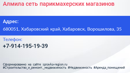 Алмила, сеть парикмахерских магазинов по адресу 680051, Хабаровский край, Хабаровск, Ворошилова, 35 в дальнейшем Организация, размещена в следующих категориях: