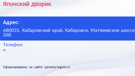 Японский дворик по адресу 680031, Хабаровский край, Хабаровск, Матвеевское шоссе, 26Б в дальнейшем Организация, размещена в следующих категориях: