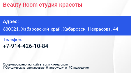Beauty Room, студия красоты по адресу 680021, Хабаровский край, Хабаровск, Некрасова, 44 в дальнейшем Организация, размещена в следующих категориях: