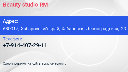 Beauty studio RM по адресу 680017, Хабаровский край, Хабаровск, Ленинградская, 23 в дальнейшем Организация, размещена в следующих категориях: