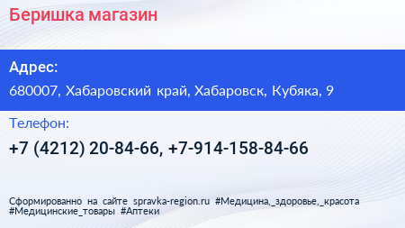 Беришка, магазин по адресу 680007, Хабаровский край, Хабаровск, Кубяка, 9 в дальнейшем Организация, размещена в следующих категориях: