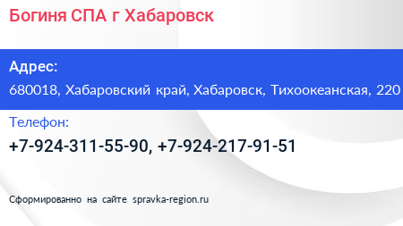 Богиня СПА, г. Хабаровск по адресу 680018, Хабаровский край, Хабаровск, Тихоокеанская, 220 в дальнейшем Организация, размещена в следующих категориях: