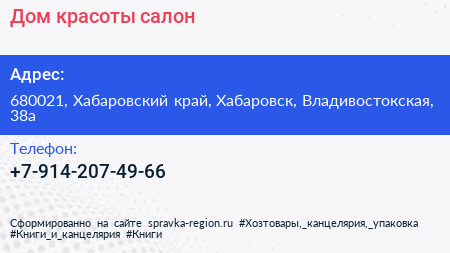 Дом красоты, салон по адресу 680021, Хабаровский край, Хабаровск, Владивостокская, 38а в дальнейшем Организация, размещена в следующих категориях: