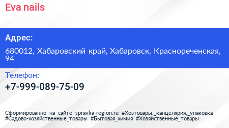 Eva nails по адресу 680012, Хабаровский край, Хабаровск, Краснореченская, 94 в дальнейшем Организация, размещена в следующих категориях: