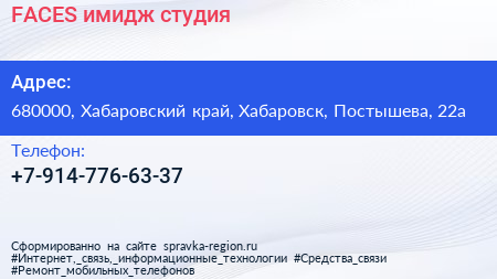 FACES, имидж-студия по адресу 680000, Хабаровский край, Хабаровск, Постышева, 22а в дальнейшем Организация, размещена в следующих категориях: