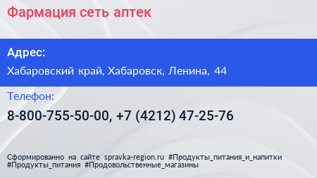 Фармация, сеть аптек по адресу Хабаровский край, Хабаровск, Ленина, 44 в дальнейшем Организация, размещена в следующих категориях: