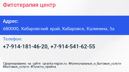 Фитотерапия, центр по адресу 680000, Хабаровский край, Хабаровск, Калинина, 5а в дальнейшем Организация, размещена в следующих категориях: