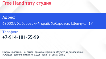 Free Hand, тату-студия по адресу 680007, Хабаровский край, Хабаровск, Шевчука, 17 в дальнейшем Организация, размещена в следующих категориях:
