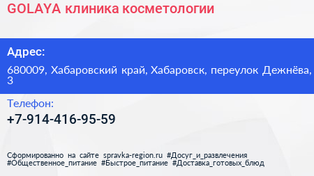 GOLAYA, клиника косметологии по адресу 680009, Хабаровский край, Хабаровск, переулок Дежнёва, 3 в дальнейшем Организация, размещена в следующих категориях: