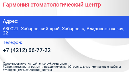 Гармония, стоматологический центр по адресу 680021, Хабаровский край, Хабаровск, Владивостокская, 22 в дальнейшем Организация, размещена в следующих категориях: