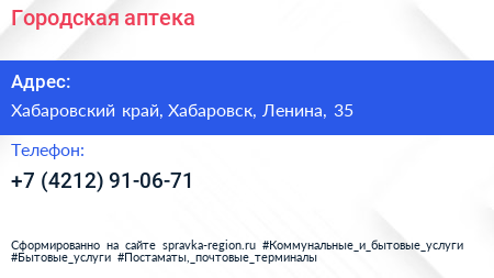 Городская аптека по адресу Хабаровский край, Хабаровск, Ленина, 35 в дальнейшем Организация, размещена в следующих категориях: