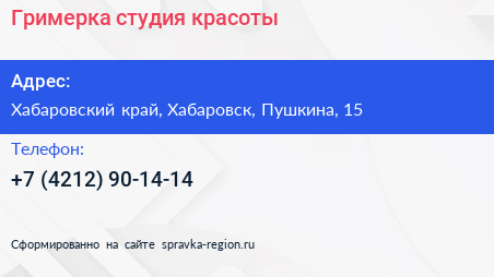 Гримерка, студия красоты по адресу Хабаровский край, Хабаровск, Пушкина, 15 в дальнейшем Организация, размещена в следующих категориях: