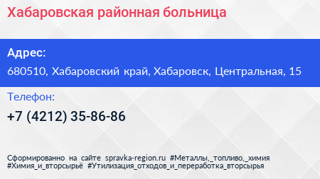 Хабаровская районная больница по адресу 680510, Хабаровский край, Хабаровск, Центральная, 15 в дальнейшем Организация, размещена в следующих категориях: