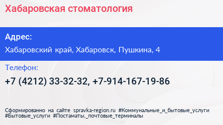 Хабаровская стоматология по адресу Хабаровский край, Хабаровск, Пушкина, 4 в дальнейшем Организация, размещена в следующих категориях: