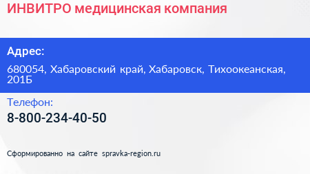ИНВИТРО, медицинская компания по адресу 680054, Хабаровский край, Хабаровск, Тихоокеанская, 201Б в дальнейшем Организация, размещена в следующих категориях: