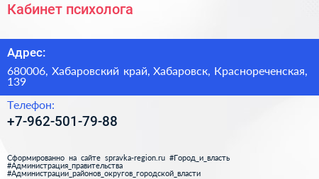 Кабинет психолога по адресу 680006, Хабаровский край, Хабаровск, Краснореченская, 139 в дальнейшем Организация, размещена в следующих категориях: