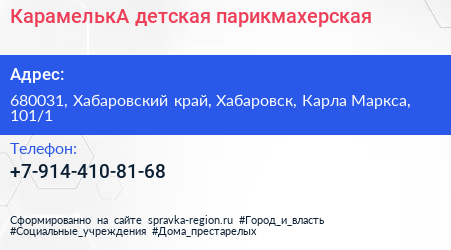КарамелькА, детская парикмахерская по адресу 680031, Хабаровский край, Хабаровск, Карла Маркса, 101/1 в дальнейшем Организация, размещена в следующих категориях: