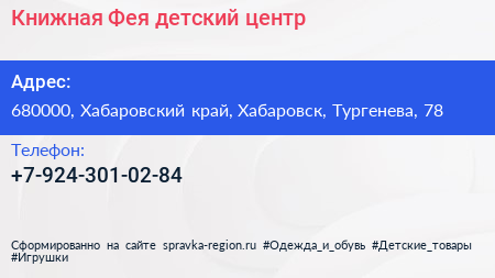 Книжная Фея, детский центр по адресу 680000, Хабаровский край, Хабаровск, Тургенева, 78 в дальнейшем Организация, размещена в следующих категориях:
